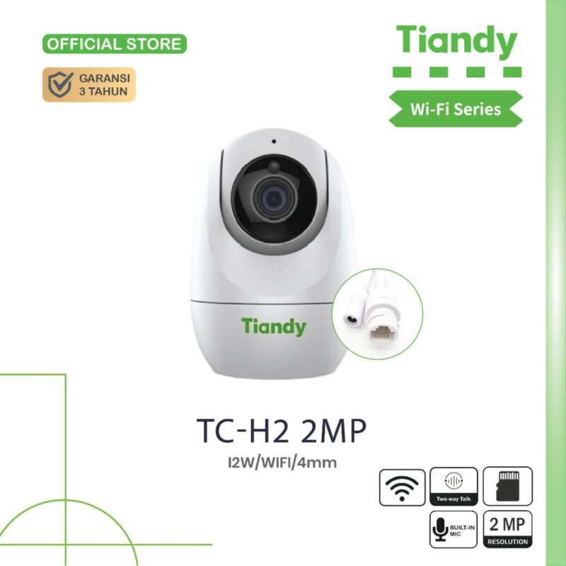 TC-H2 2MP Putih Spec:I2W/WIFI/4mm 2MP Fixed Color Maker Wi-Fi PT Camera Key Features – Plastic housing – Up to 2MP,1920×1080@30fps – S+265/H.265/H.264B/H.264M/H.264H – Color:0.05Lux@(F2.0,AGC ON),B/W:0Lux with IR – IR range up to 15m – 1×Built-in Mic, 1×Built-in Loudspeaker – Support microSD/microSDHC/microSDXC card,up to 256GB – Operating conditions -10℃-45℃(14℉~113℉), ≤95%RH – DC12V±5% Max.7.5W Garansi Tiandy 3…